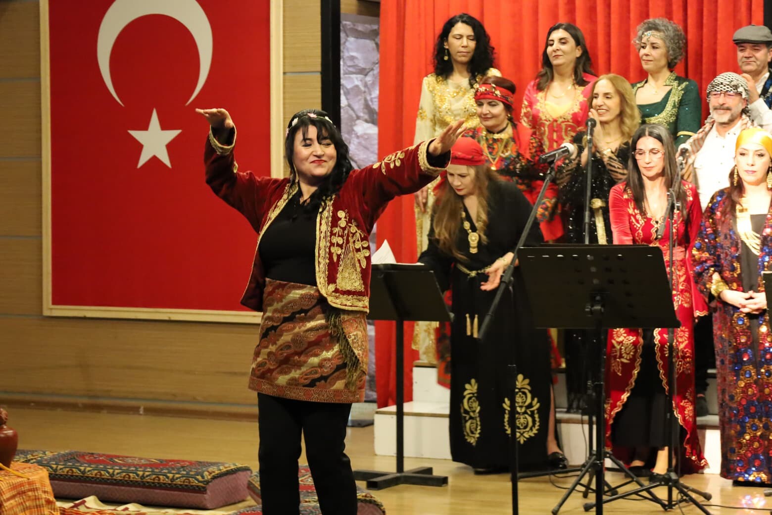 Koro, Urfa yöresine ait eserleri başarıyla seslendirirken, salonu dolduran izleyiciler türkülere coşkuyla eşlik etti. Sıra gecesinin geleneksel atmosferi sahneye de yansıdı. Türküler okunurken, Çiğli’nin tanınmış simalarından Halil Küçükçanakçı, sahnede çiğköfte yoğurarak geceye renk kattı.